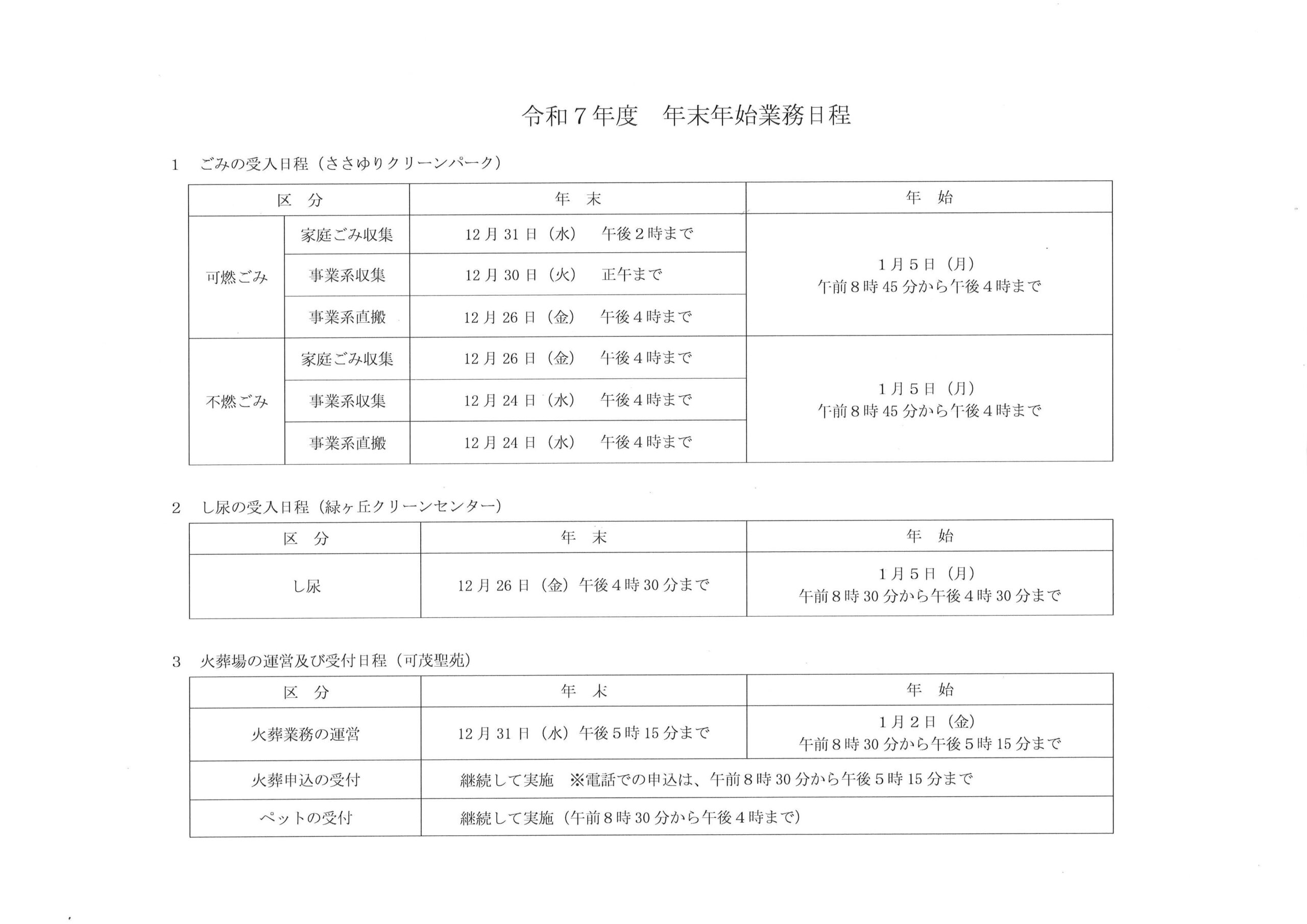 令和7年度の各施設における業務予定は次のとおりとなります。